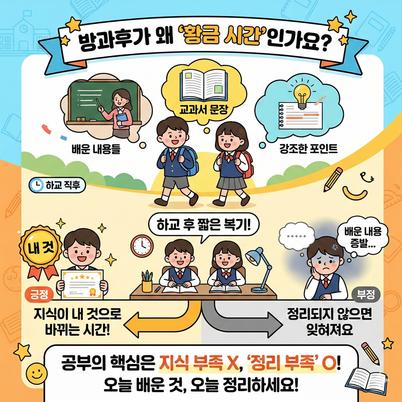 단순히 공부하기 좋은 시간이어서가 아니에요. 하교 직후엔 학교에서 배운 내용이 아직 머릿속에 남아 있고, 수업의 흐름이나 교과서 문장, 선생님이 강조한 포인트도 비교적 생생하게 떠오르거든요.