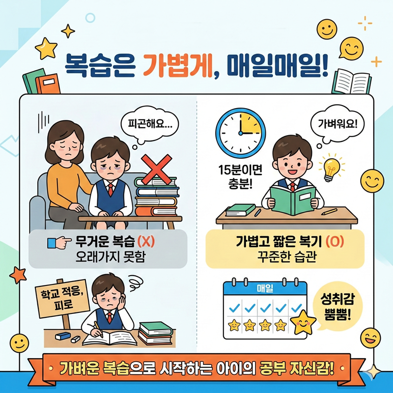 맞아요. 아직 학교에 적응하느라 에너지를 쓰고, 부모님도 새 리듬에 맞추느라 더 지치기 쉽습니다. 그래서 지금의 복습은 무겁게 시작하면 오래가기 어렵습니다. 대신 가볍게, 짧게, 매일 하는 게 정답이에요.